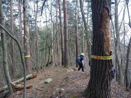立ち枯れている木には、すべて「立入禁止」のテープが巻かれている。