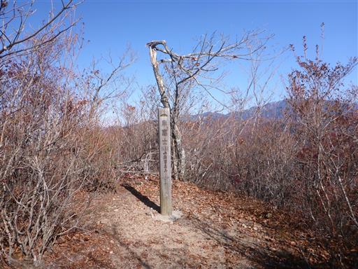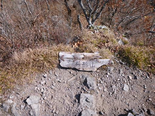 山頂は岩峰で、端に小さな山頂標識が置かれている。