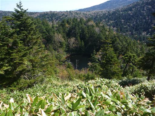 山頂から少し進んだ先から大沼池を見下ろすことができる。