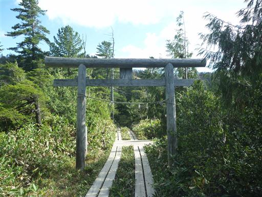 四十八池の畔に下りてくる。こちらの登山道入口には鳥居が立っている。