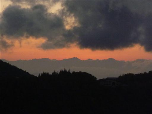 夕方、外に出てみると正面に北アルプスのシルエットが見えている。