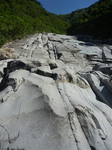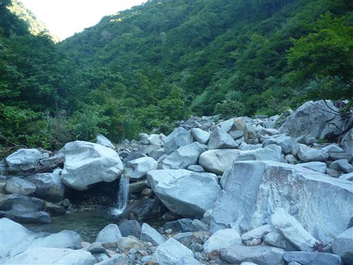 割引沢に下り立つ。真白な巨岩が折り重なっている。