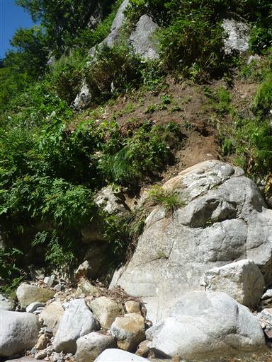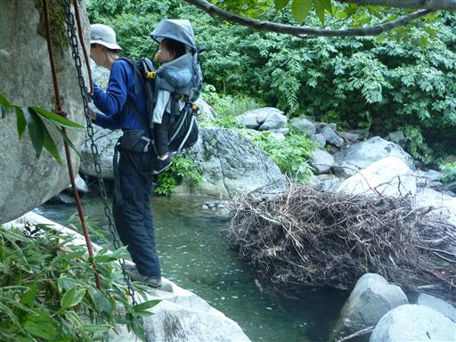 高巻道から沢に下りてくるところは足場がなく、手でつかまるものもなく非常に危険。