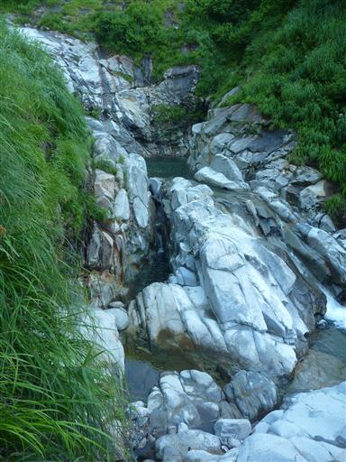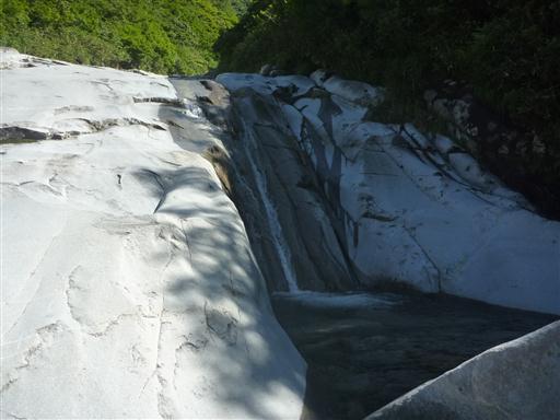 水は岩の右の方に溝を作って流れている。