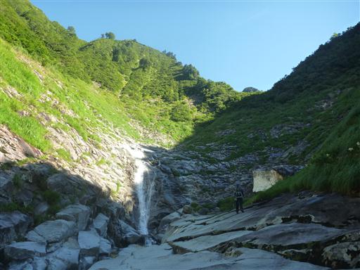 左から回り込んで滝の右岸をロープを頼りに登っていく。