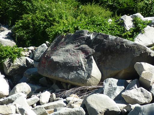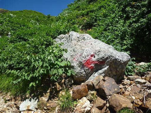 大きな岩に赤いペンキでルートが記載されている。