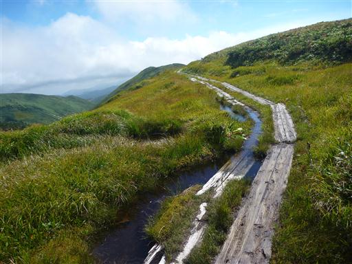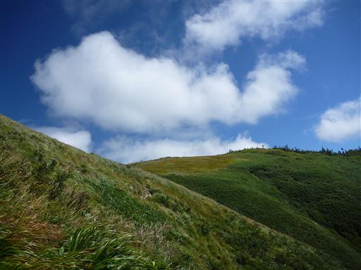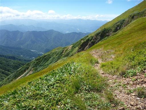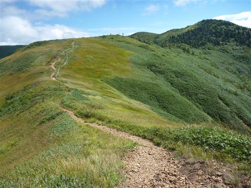 笹原が広がる展望の良い道を下って行く。登りの道と比べると格段に歩きやすい。