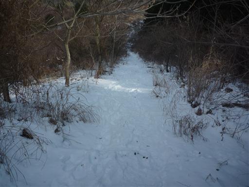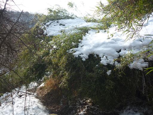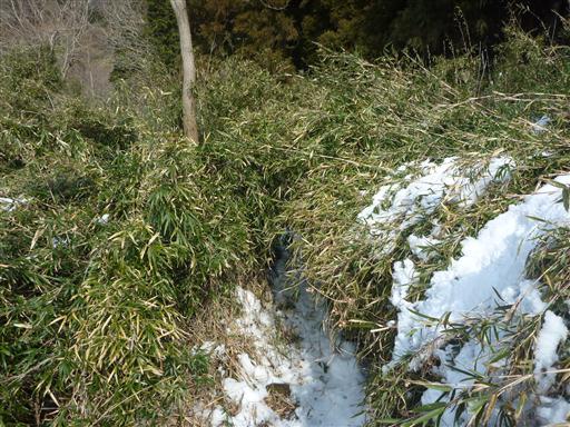 笹の上に雪が積もっていて、その重みで登山道に笹が覆いかぶさっている。