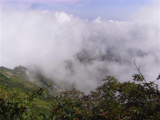 山頂付近からの展望は雲に覆われていて、辛うじて水晶尾根が見える程度。