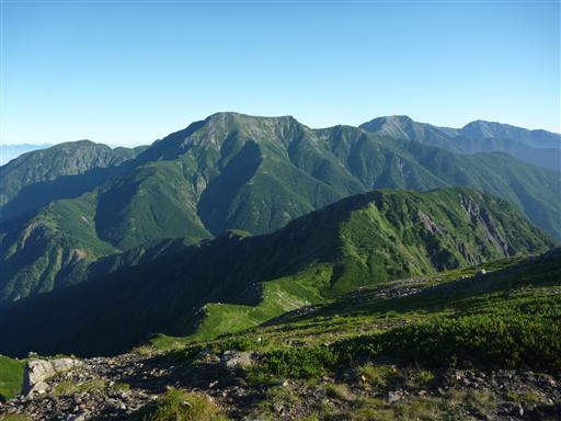 上河内岳以南の南アルプス。緑に覆われた美しい山脈が続いている。