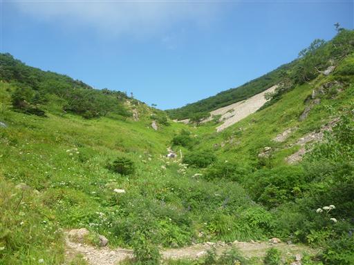 上河内岳から南下していくと、アルプスの稜線とは思えないような風景が広がる。