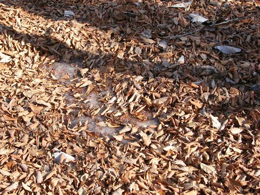 落ち葉が積もっていて見えにくいが、その下は凍りついている。