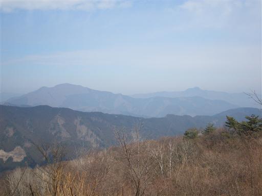 奥多摩三山の御前山(左)と大岳山(右)が見える。