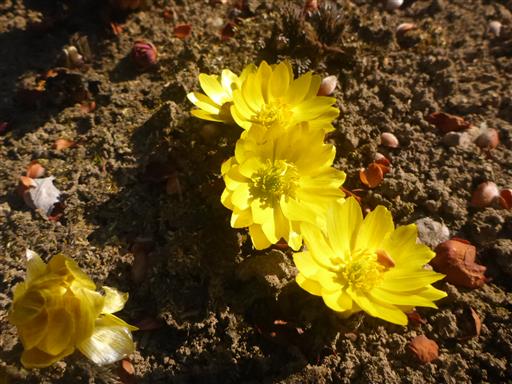 神社の境内にフクジュソウがたくさん咲いている。