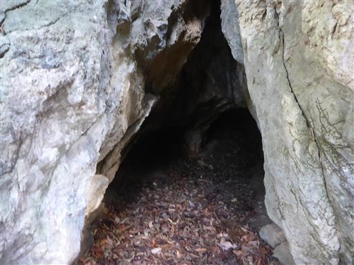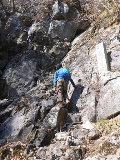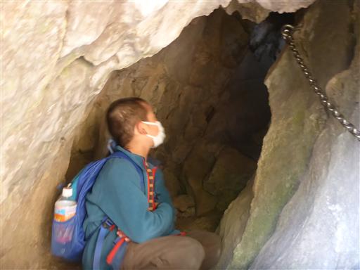 鎖場を登る。登った先の左に小さな岩穴がある。