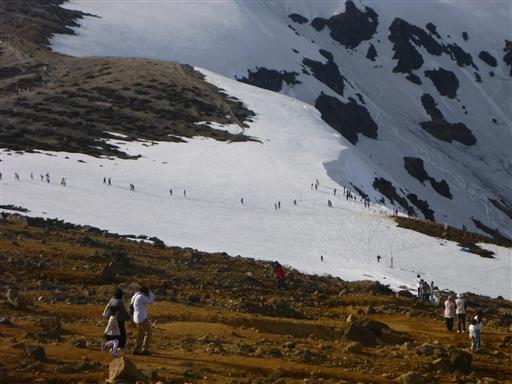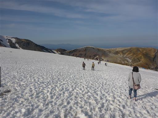 振り返ると、御釜に続く雪の上を多くの観光客が歩いている。