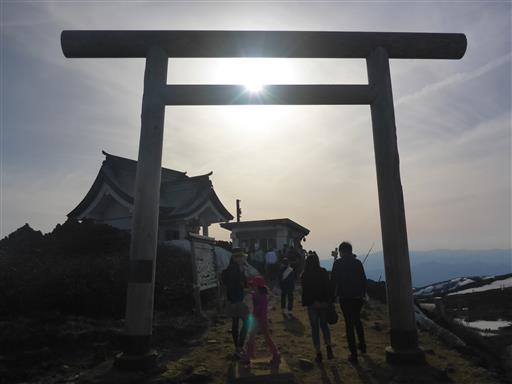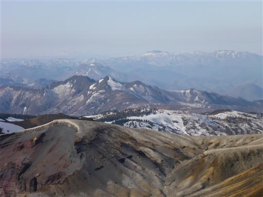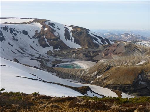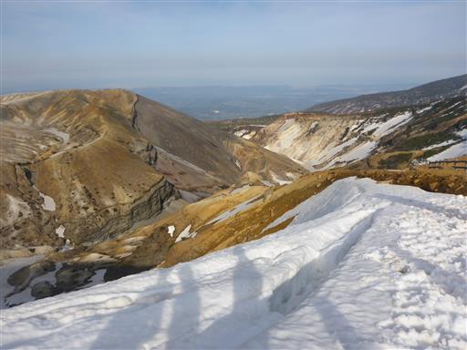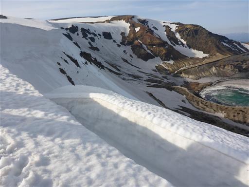 御釜に向かって雪の斜面に蛇行した線が見えるが、スキーヤーが滑り降りた跡だろうか?