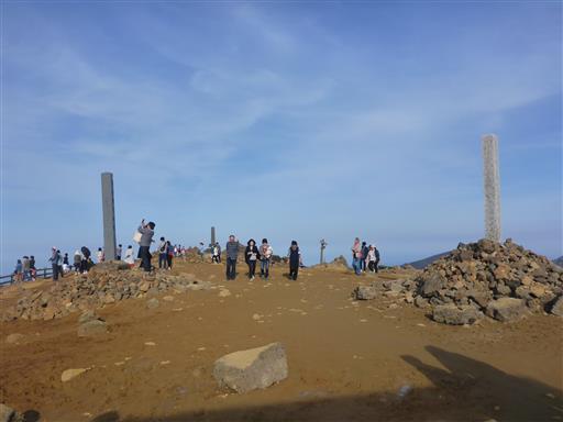 蔵王ハイラインから車で刈田岳に来た人は、ここから御釜を眺めている。