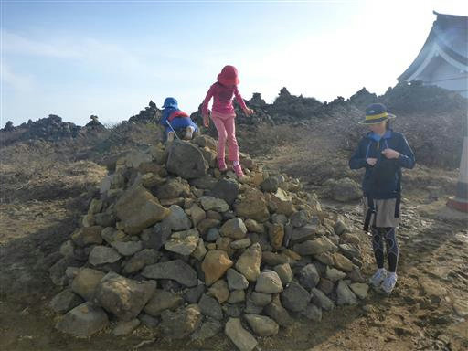子供たちは山頂にある積まれた石の上に登って遊んでいる。