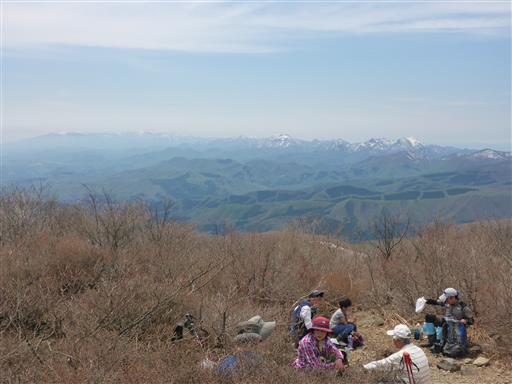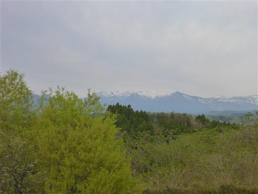 遠くの方にぼんやりと見えている雪山は朝日連峰だ。