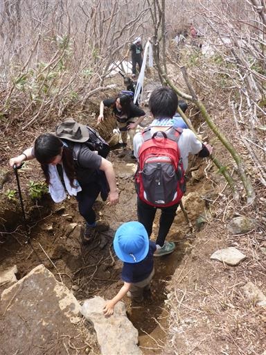 所々で雪が残る登山道はぬかるんでいて、人も多いため歩きにくい。