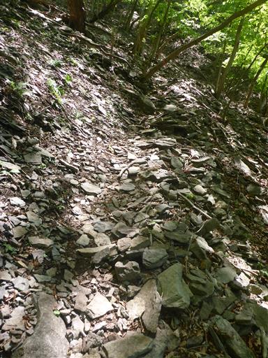 山頂近くは薄く割れた石が散在している。