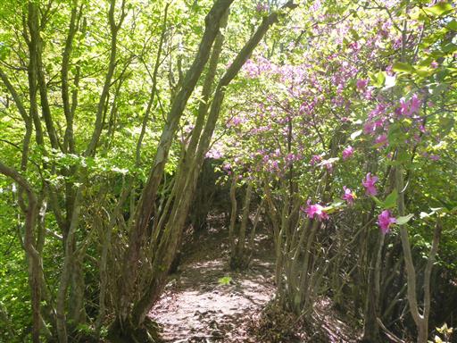 登山道の周囲にミツバツツジが見られる。