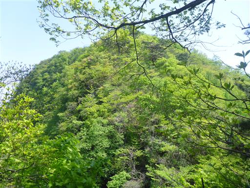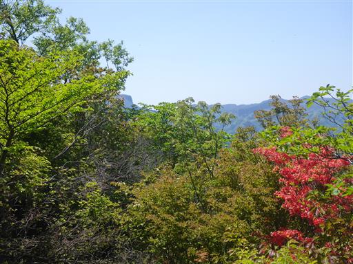 昼食を取ったら山頂出発。西峰からは先ほど登った本峰が見える。新緑がきれいだ。