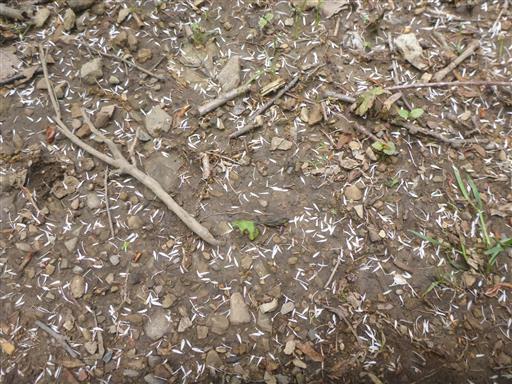 地面に白い花びらが無数に落ちている。何の花だろうか?