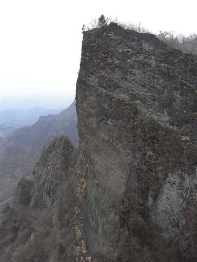 崖は垂直に切れ落ちている。下の方にも小さな岩山が散在している。
