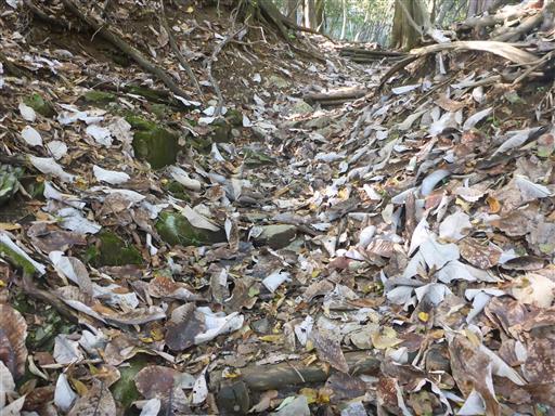 ホオノキの大きな葉で地面が埋め尽くされている。