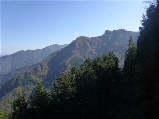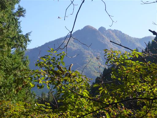 木の間から山を見上げる。見えているのは妙法ヶ岳だろうか?