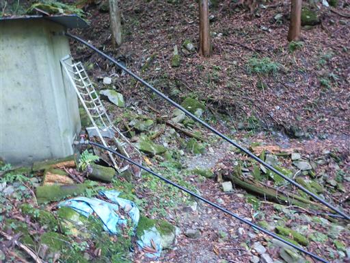二本のホースの間を通る。アクロバティックな登山道だ。