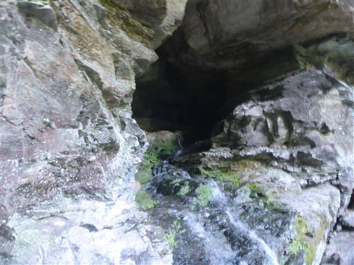 岩の奥の小さな穴から水が流れ出ている。ちょっと探検は難しそうだ。