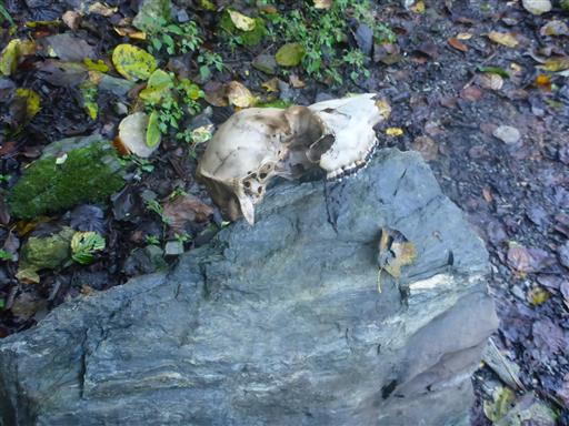 岩の上に置かれている不思議な物体。15秒ほど考えて、ようやく動物の頭の骨と認識する。