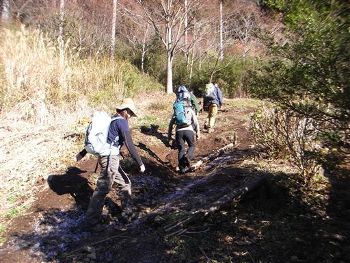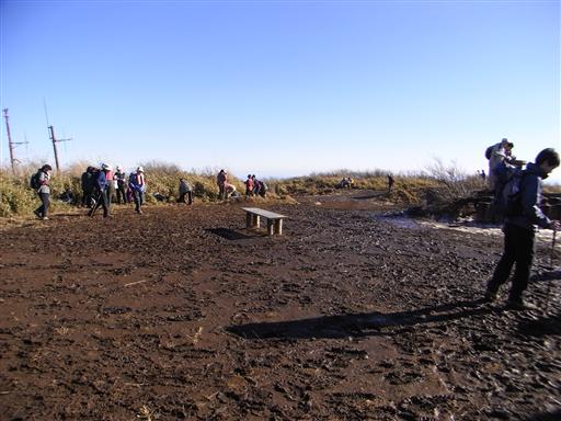 山頂付近は霜柱が解けて泥だらけになっている。