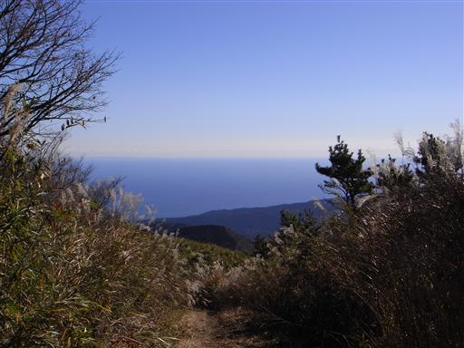 明星ヶ岳から続く尾根道の向こう側には真青な海が見える。