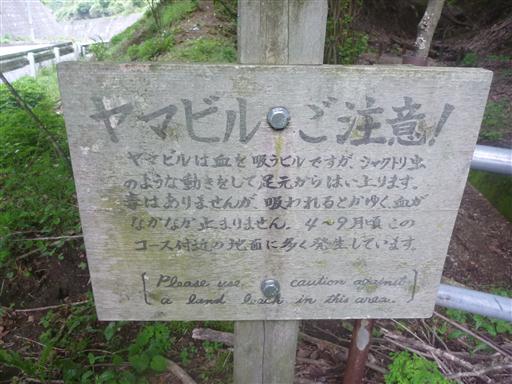ヤマビル注意の看板。この辺りはヤマビルの多い地域で、この季節はまさにヤマビルが出てくる季節。