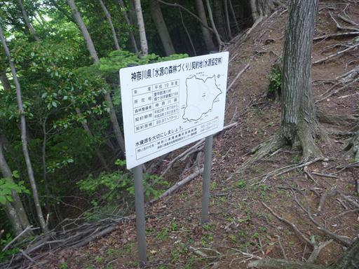 水源の森の標識。登山道でないようなところにも、このような標識は存在する。