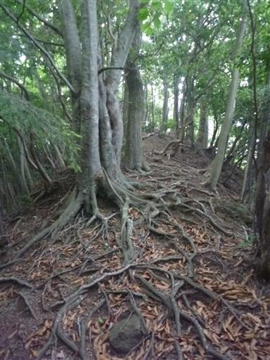 木の根が露出している。木の根の露出は「登山者の踏み付けが~」と説明されることが多いが、