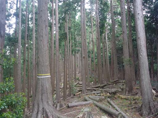 宮ヶ瀬尾根の北上を続けると、あたりは植林地帯になる。枝が散乱していて歩きにくい。