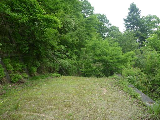 しばらく登山道を歩くと、車道に到着する。ここも作りかけで放棄された道の続きだ。