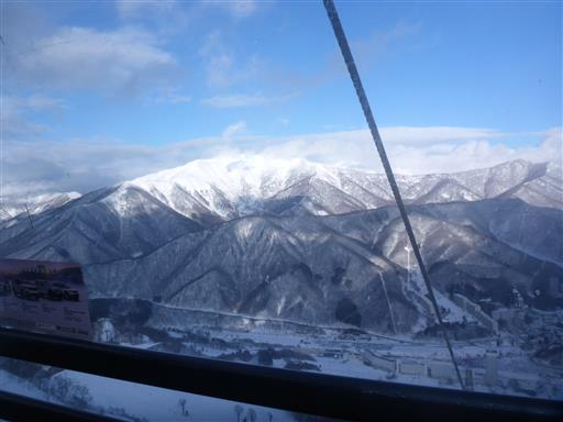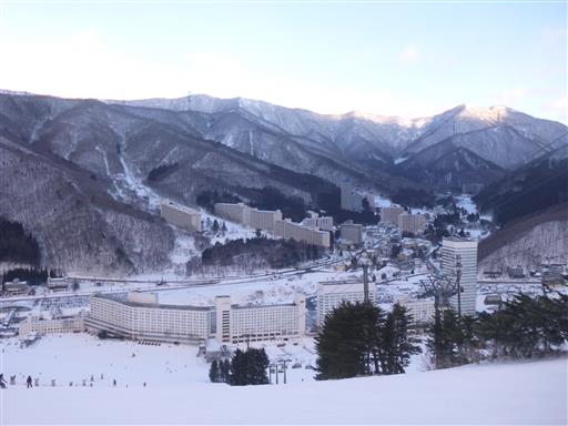 眼下に苗場の町を見下ろす。手前にずらっと並んでいるのが苗場プリンスだ。