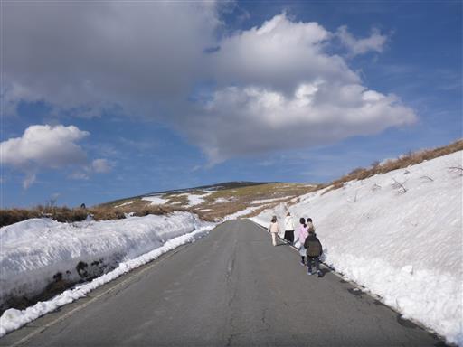 眺めの良い車道を雪を投げて遊びながら、ゆっくりと歩いていく。