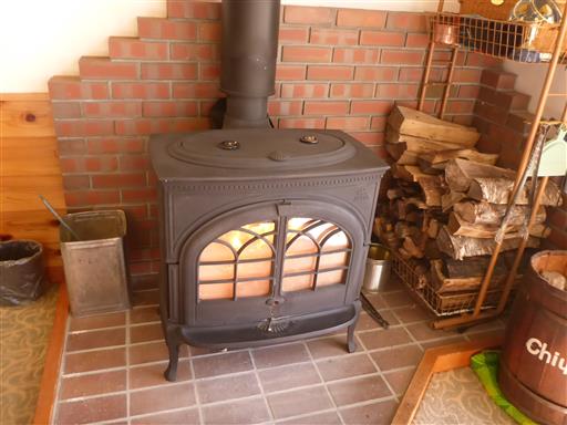 薪ストーブ。4月とはいえ、この地はまだまだ寒く、暖かい炎に癒される。