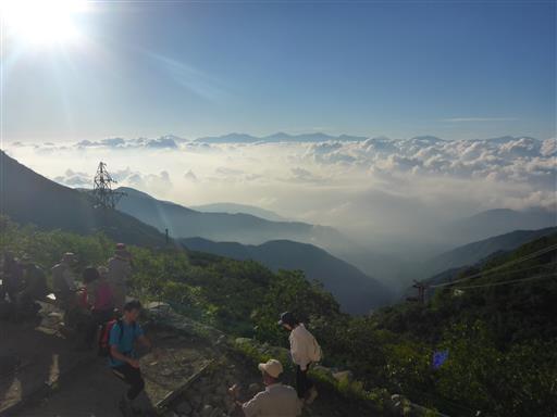 反対側には雲海と、その奥に南アルプスの山が見えている。