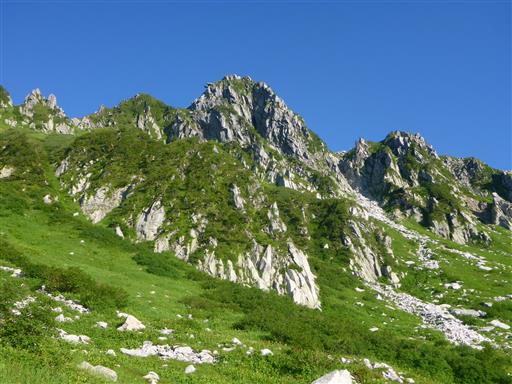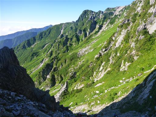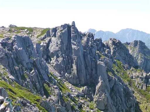 宝剣岳の下に続く岩壁が凄まじい。遠くに見えるのは空木岳と南駒ヶ岳だ。