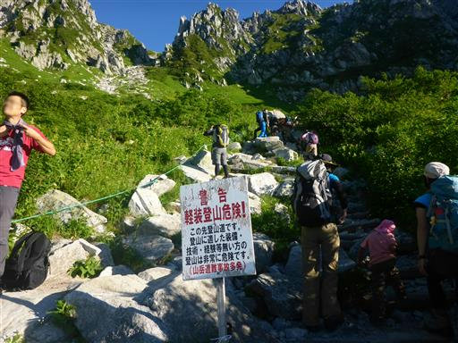 付近を周遊する観光客が間違えて入り込まないよう「軽装登山危険」との標識が出ている。