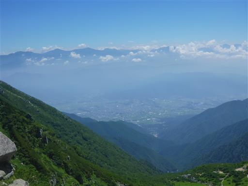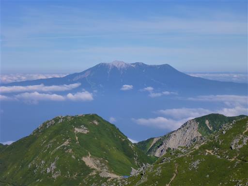 中岳の中腹から乗越浄土方面を見渡す。宝剣岳が一際目立っている。