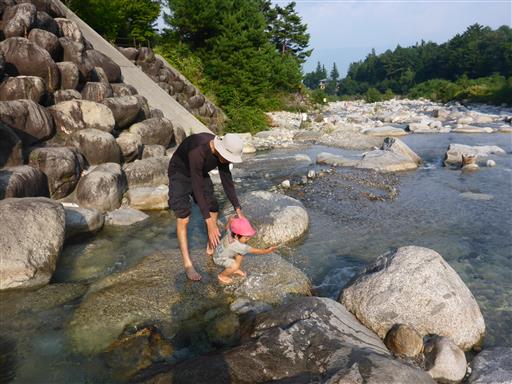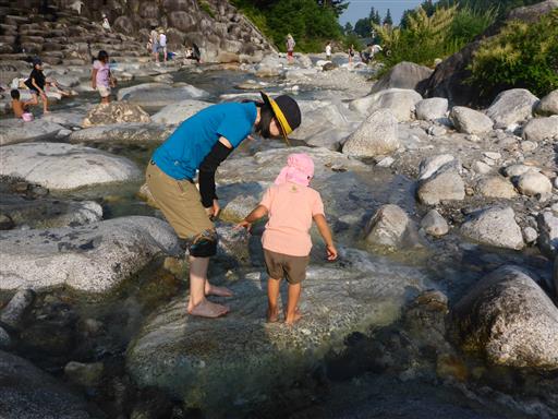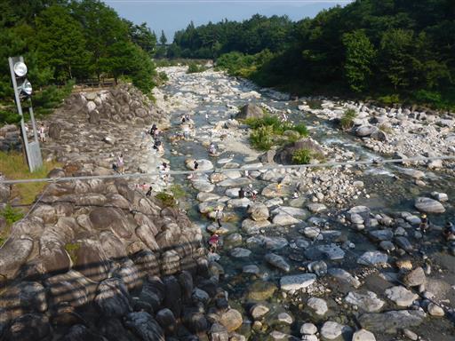 下を流れるのは太田切川。水遊びしている人がたくさんいる。